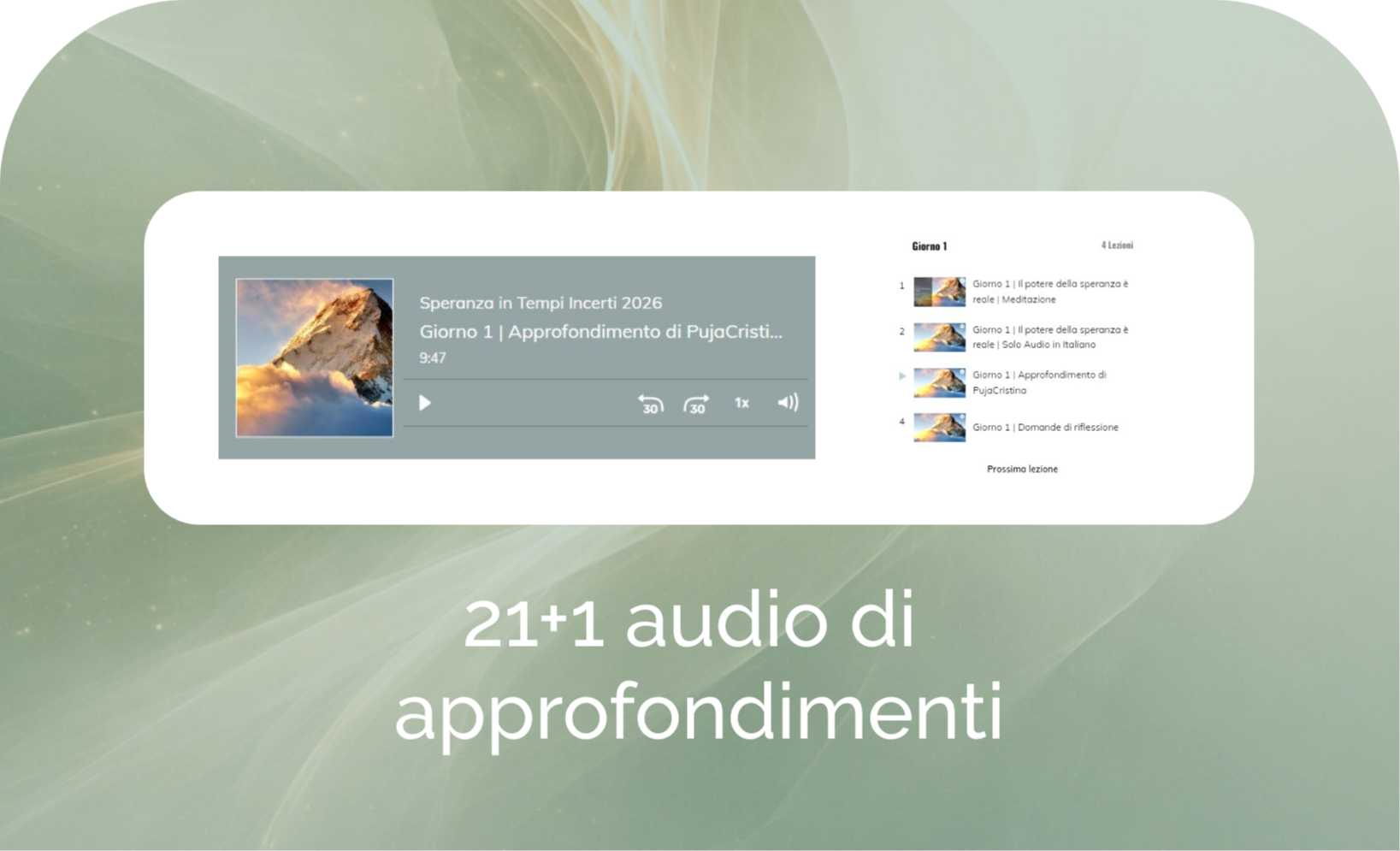 21+1 audio della durata di 25 minuti l’uno, guidati da Deepak: 10 minuti di lezione + 15 minuti di meditazione con la tecnica della ripetizione silenziosa del mantra.